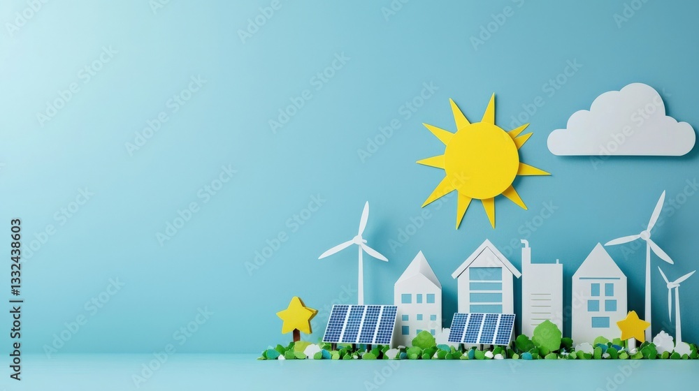 A paper-art style cityscape with wind turbines and solar pan Wallpaper