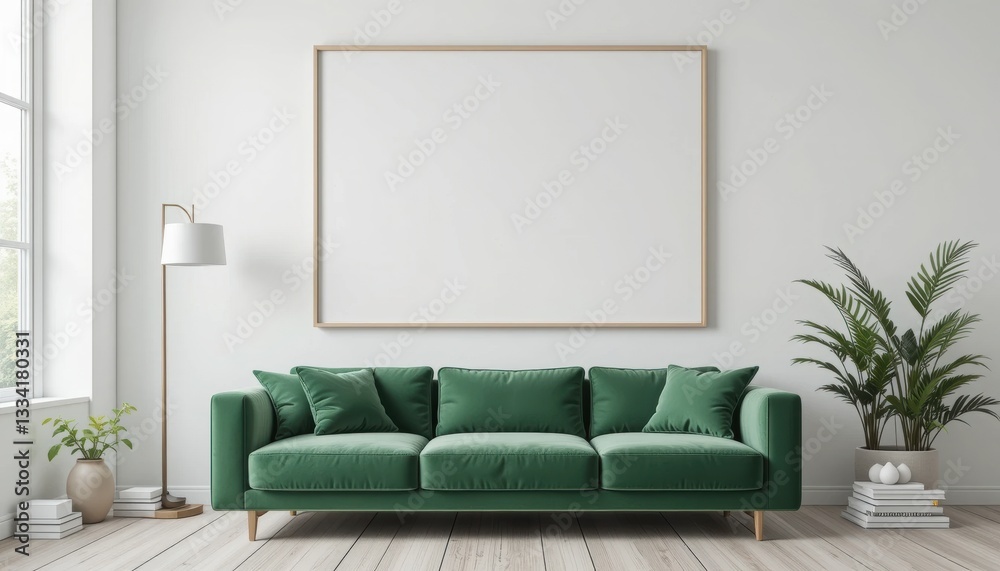 minimalistic interrior desighn with green sofa and blank canvas mockup on a wall. A 3D render of a minimalist living room with a green velvet couch and a large square picture frame on a wall