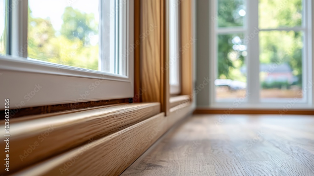 Sunlight illuminates a wooden window frame, highlighting a smooth piece of wood resting on the sill while lush greenery is visible outside in the tranquil scene