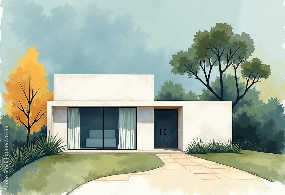 落ち着いたミニマリスト建築:庭のある水彩木版画住宅、晴れた天気、青空、クリーンなライン、洗練されたデザイン、シンプルな大理石の要素。