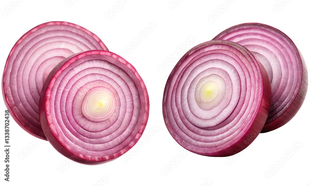 Three bulbs of sliced red onion are displayed, isolated on a white background, highlighting the vibrant color and texture of the red onion. The red onion is perfect for culinary use.