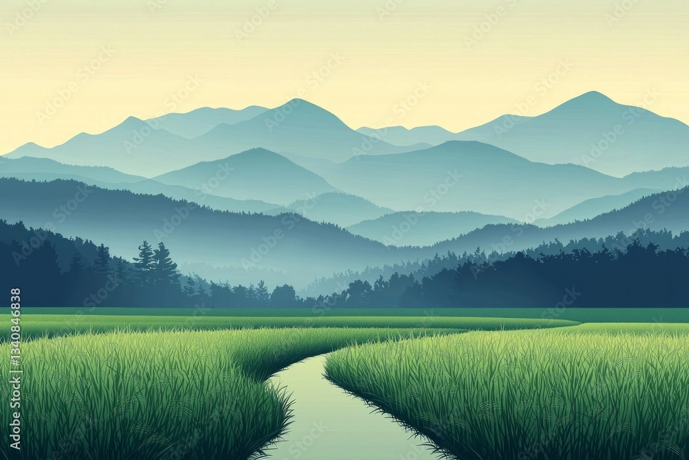 Serene mountain lake reflection, lush green valley, misty hills, tranquil landscape, nature background