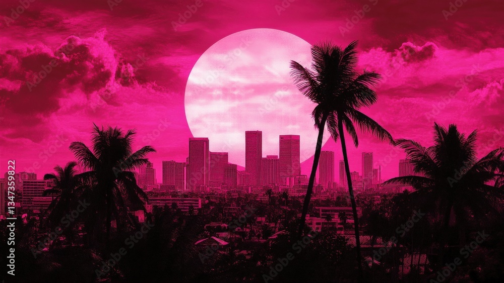 Vibrant Sunset Over A Cityscape With Palm Trees Wallpaper Mural - Decorly Solutions | Decorly Solutions