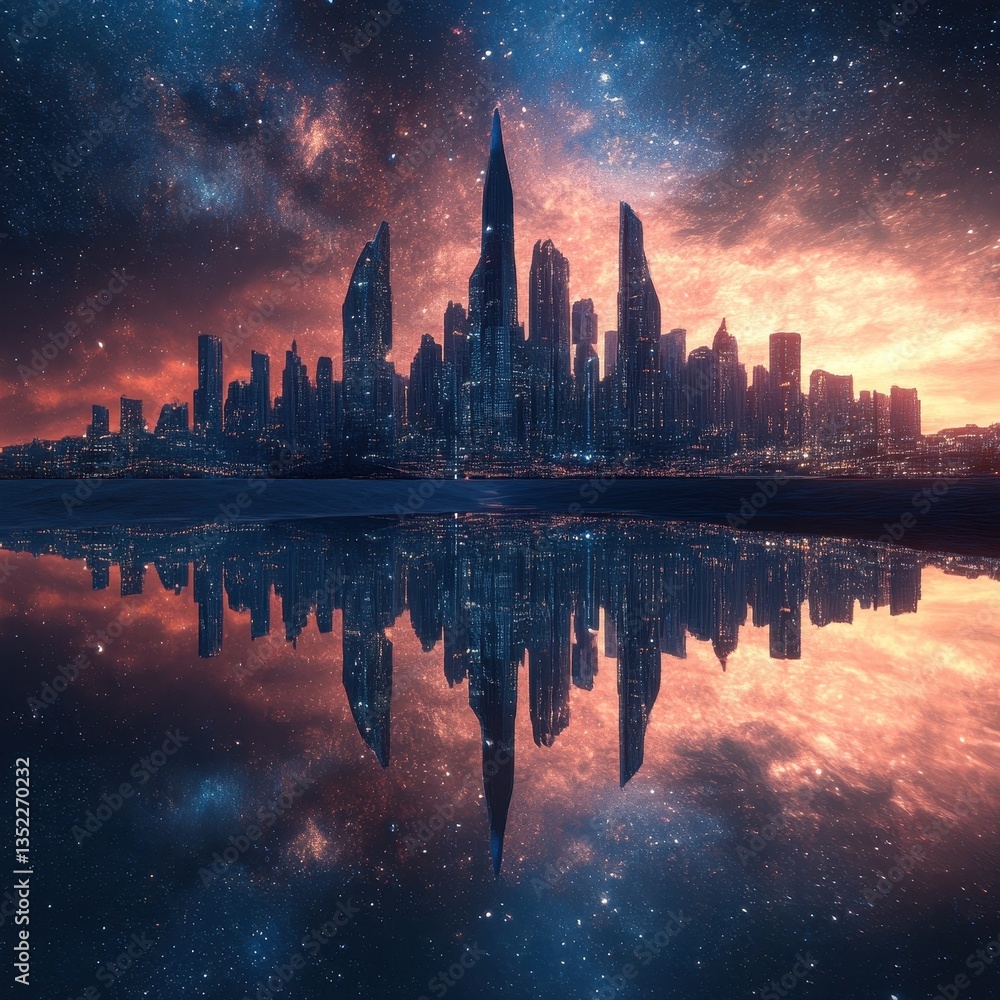 Futuristic City Reflected In Water Under A Starry Night Sky Wallpaper