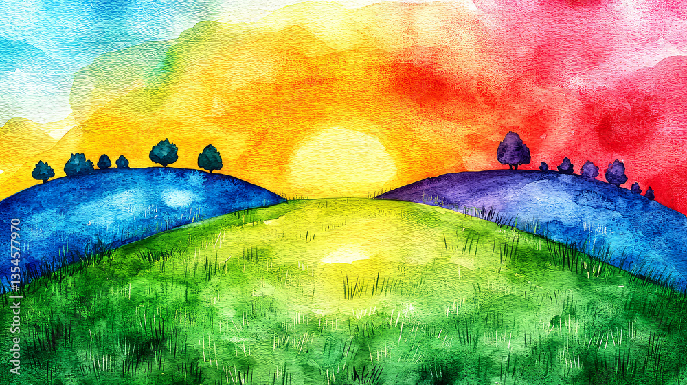 Vibrant Sunset Landscape Painting Colorful Hills Trees And Wallpaper Mural - Decorly Solutions | Decorly Solutions