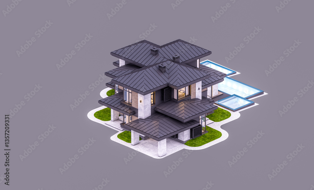 3d rendering of modern two story house with gray and wood accents, large windows, parking. In the evening Isolated on gray
