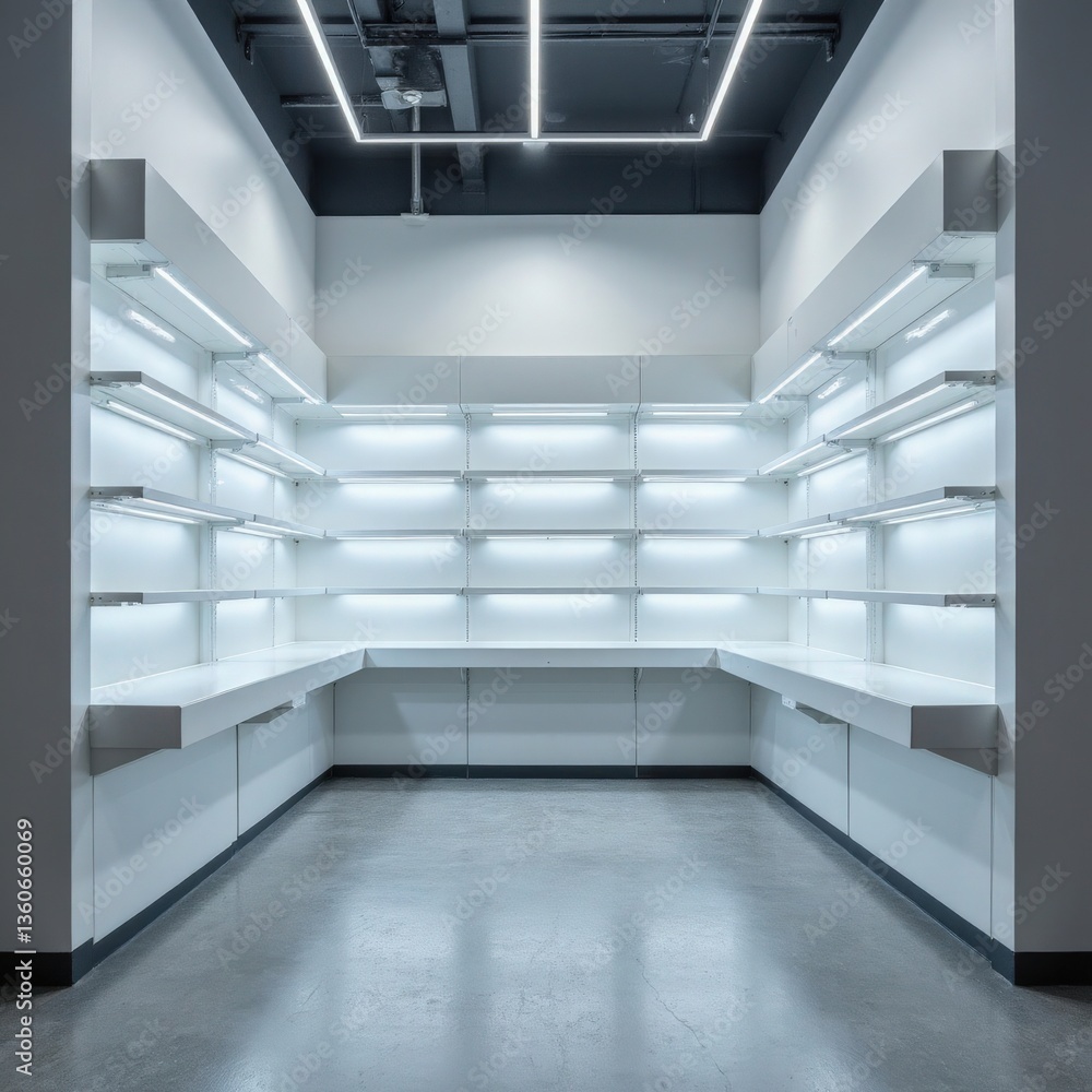 Vacant Pharmacy Shelves With Backlit Panels And Diffused Wallpaper Mural - Decorly Solutions | Decorly Solutions