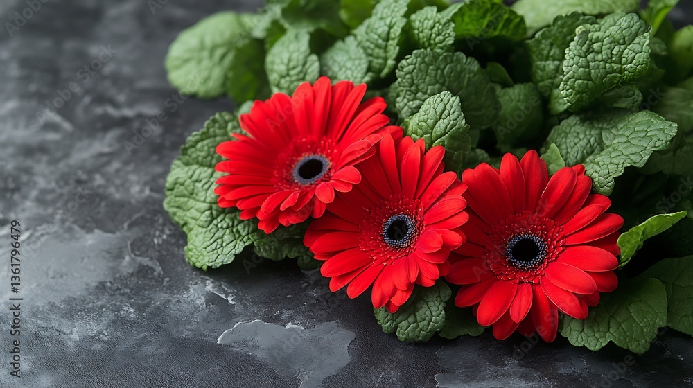 Three red gerbera daisies resting upon vibrant green leaves Wallpaper