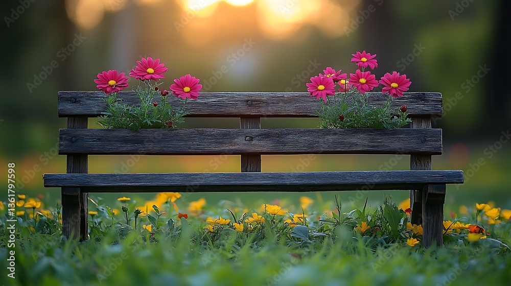 A Wooden Bench Holds Flowering Plants In A Wallpaper Mural - Decorly Solutions | Decorly Solutions