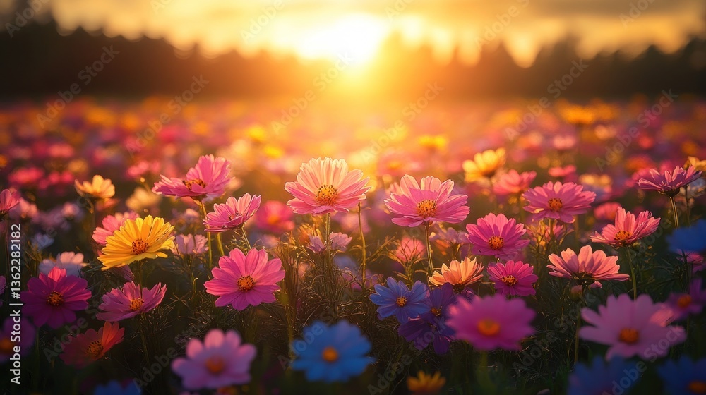 Vibrant Cosmos Flower Field, Sunrise, Colorful Blooms, Nature Photography, Spring Flowers, Stunning View