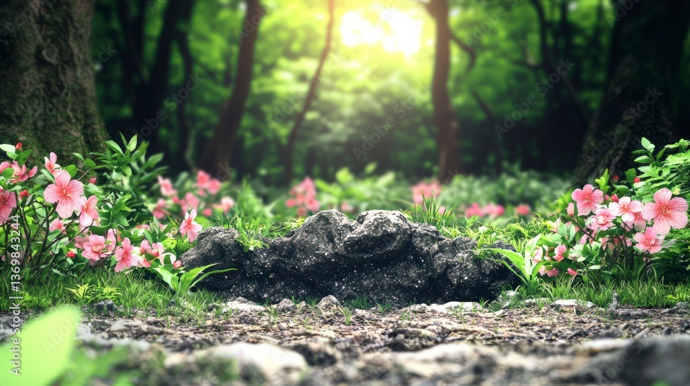 Serene Forest Scene With Pink Flowers And Rocks Wallpaper Mural - Decorly Solutions | Decorly Solutions