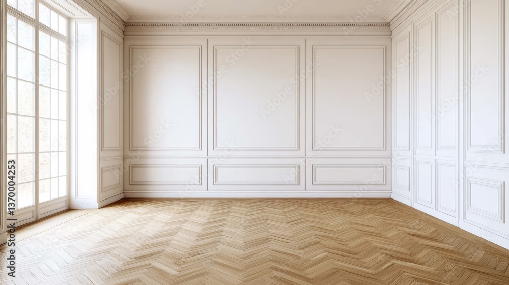 Elegant Room White Walls Herringbone Floor and Window Light Wallpaper