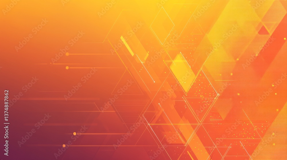 Abstract design with a colorful gradient background, geometric figures in various shapes, and white vector lines
