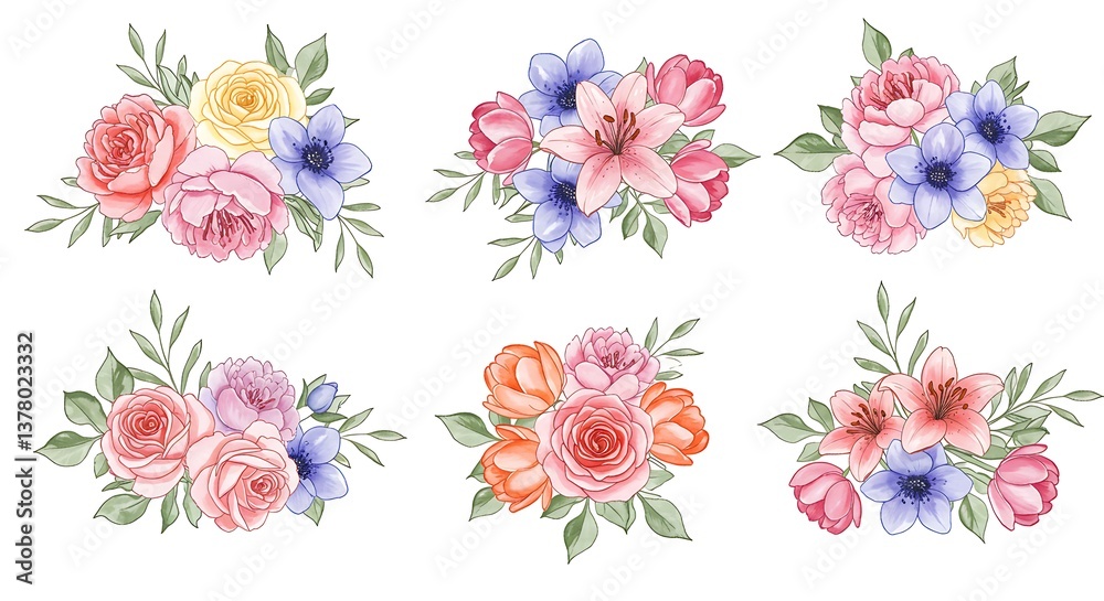 Watercolor Flower Bouquets Isolated On A White Background Wallpaper Mural - Decorly Solutions | Decorly Solutions