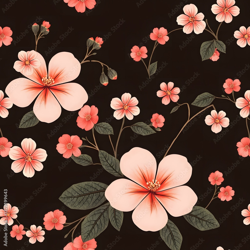 Elegant Coral And Peach Floral Seamless Pattern Design On Dark Brown Background