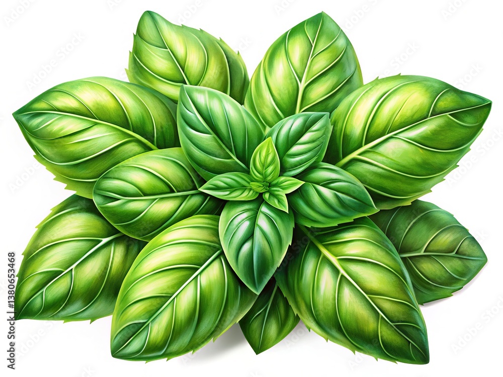 Fresh green basil leaves isolated on white background. Aromatic herb used in cooking for its fragrant, slightly peppery flavor.