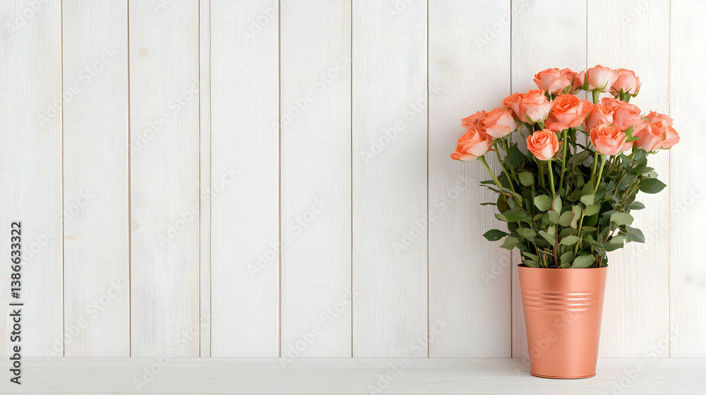Coral Roses In Copper Pot Against White Wooden Wallpaper Mural - Decorly Solutions | Decorly Solutions