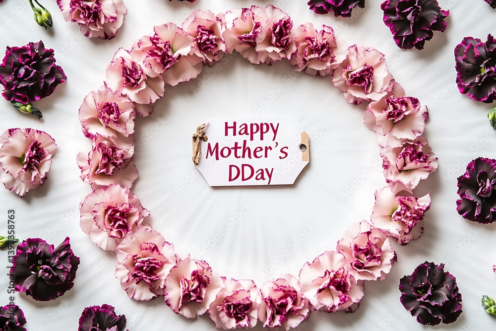 A charming display of pastel carnations encircling a "Happy Mother's Day" tag on a white painted wood panel.