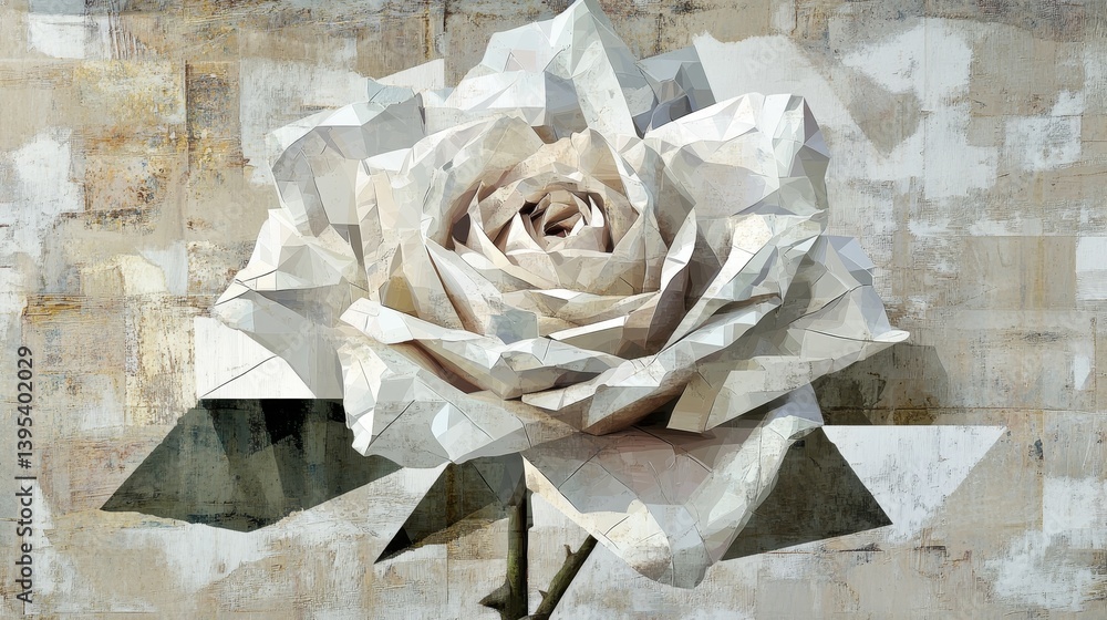 Abstract rose with hexagonal petals and geometric lines in pastel pink and silver
