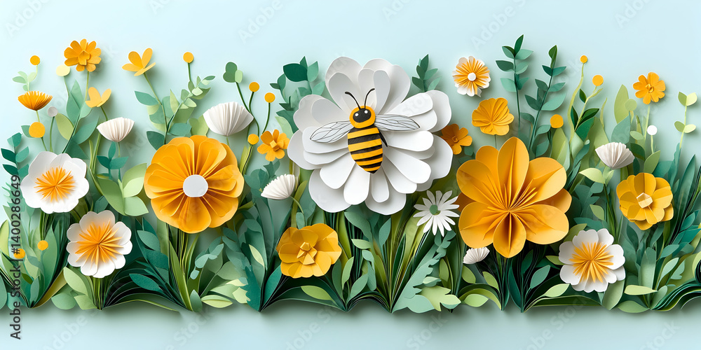 Paper Flowers Leaves And Bee Adorn A Light Wallpaper Mural - Decorly Solutions | Decorly Solutions