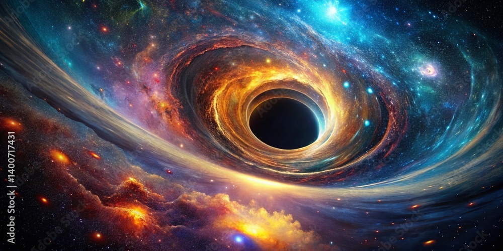 Cosmic Vortex A swirling nebula envelops a dark stellar singularity, celestial bodies and vibrant gaseous formations paint a breathtaking panorama across a vast expanse of space.