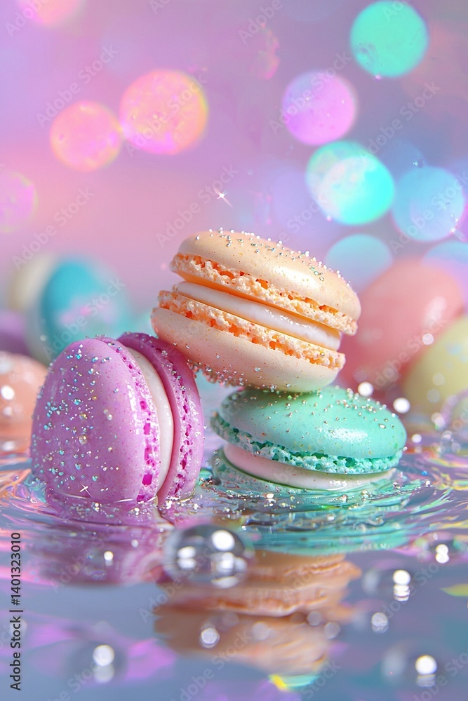 Colorful macarons arranged beautifully on a soft blue background with sparkling lights