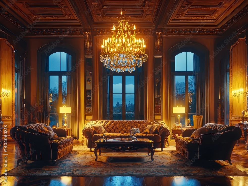 Opulent room with large windows tufted furniture chandelier Wallpaper