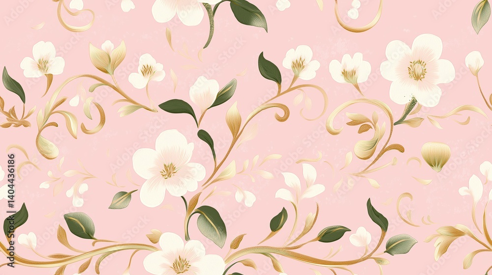 Vintage Seamless Floral Pattern with Pink Flowers and Gold Swirls – Elegant Design on Soft Pastel Background