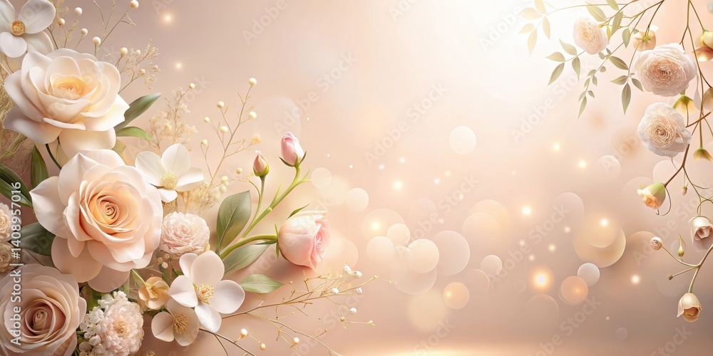A gentle scattering of pastel blossoms and shimmering spheres adorns a soft, blank canvas for your creative expression