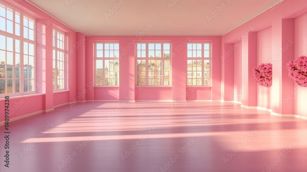 Bright Pink Room with Large Windows and Floral Accents Inter Wallpaper