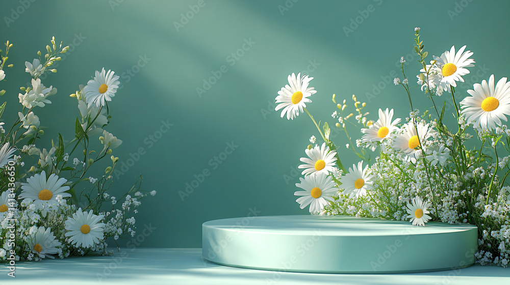 Product Display with Daisies:  A clean and minimalist product display featuring a round, white podium adorned with delicate white daisies on a soft blue background.