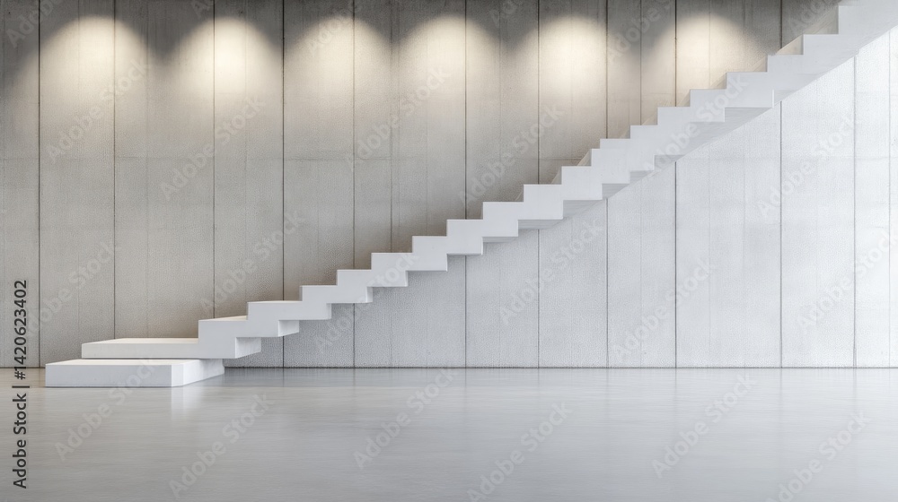 Modern concrete staircase in minimalist interior.  A simple, clean design features a concrete staircase ascending against a wall of textured concrete.  Ambient lighting highlights the stairway
