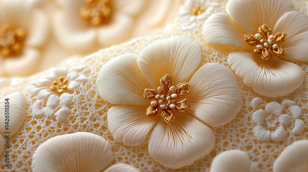 Intricate floral embroidery, cream lace fabric.