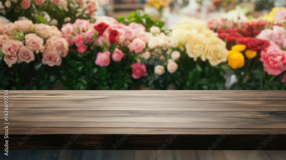 Amidst the blur place, a selected focus empty wooden table decorated with fresh flowers stands out, creating an ultramodern, supernatural scene with copy space
