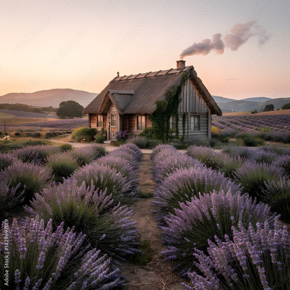 Golden Hour Lavender Field With Rustic Cottage And Wallpaper Mural - Decorly Solutions | Decorly Solutions