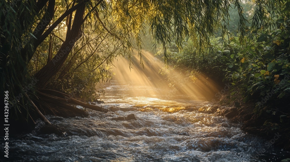 Sunbeams Stream Through Trees Onto A Flowing River Wallpaper Mural - Decorly Solutions | Decorly Solutions