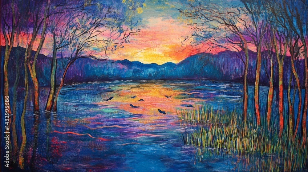 Colorful Painting Of A River Surrounded By Trees Wallpaper Mural - Decorly Solutions | Decorly Solutions