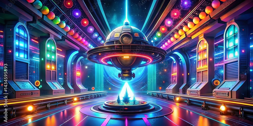 Futuristic Spaceship Design: Radiant Neon Lights & Circular Wallpaper