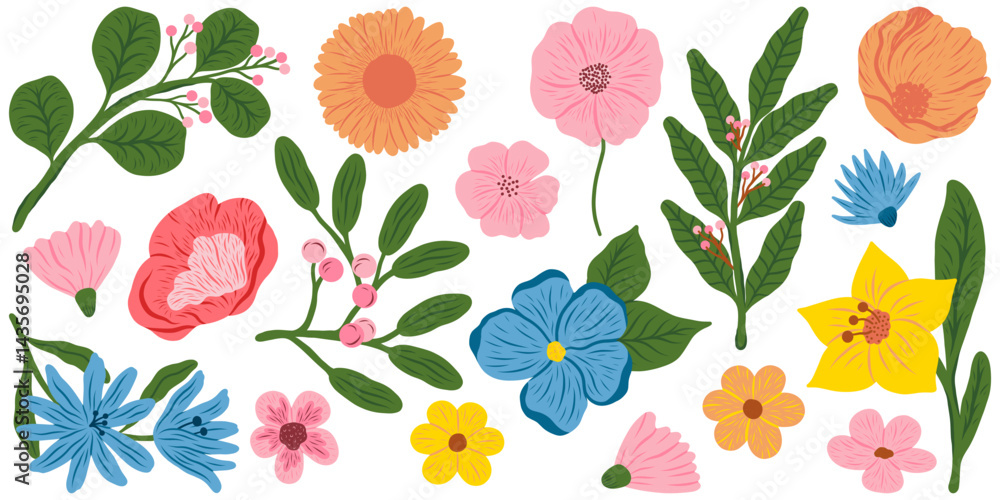Floral set. Vector flat minimalistic illustration of flowers and leaves in flat style. Retro vintage style, hand drawn decorative elements. 60s, 70s, flower icon, pastel colors, childish cute decor.