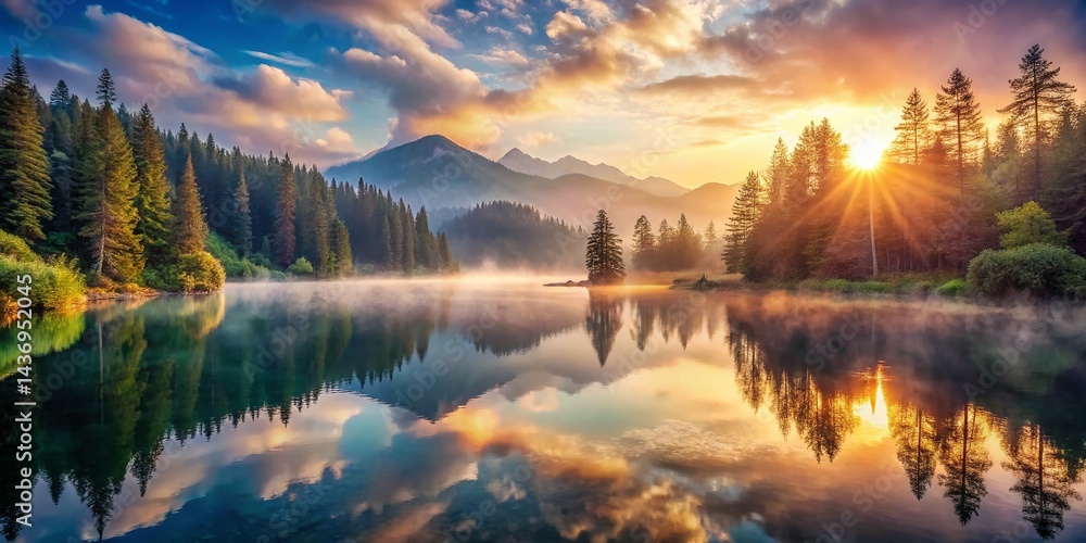 Serene Mountain Lake Reflection Misty Forest Calm Waters Wallpaper Mural - Decorly Solutions | Decorly Solutions