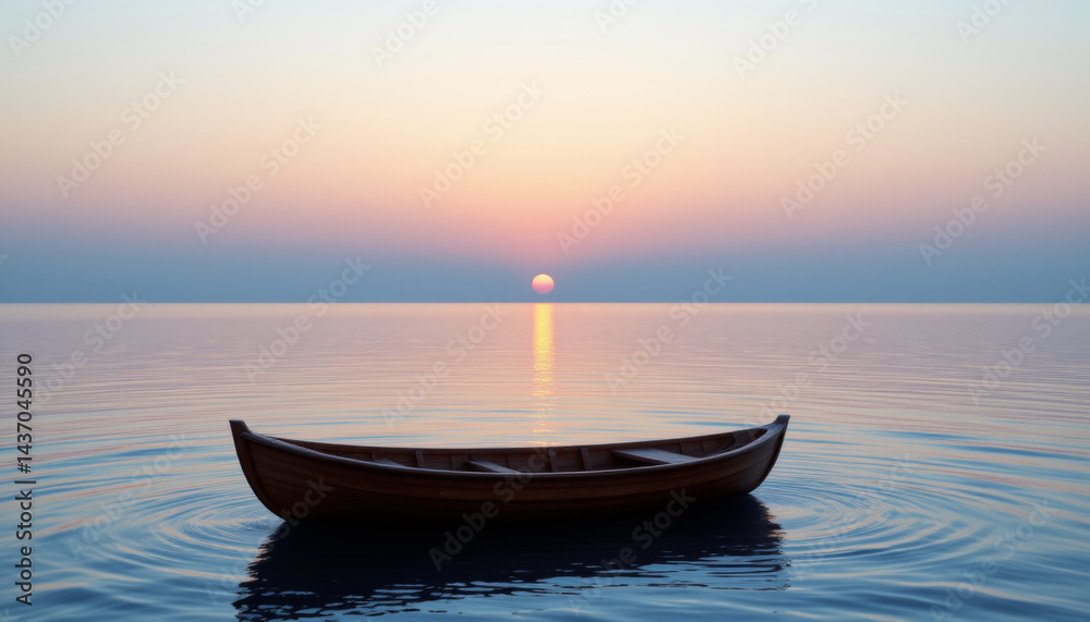 Serene wooden boat floats gently on calm waters at sunset re Wallpaper