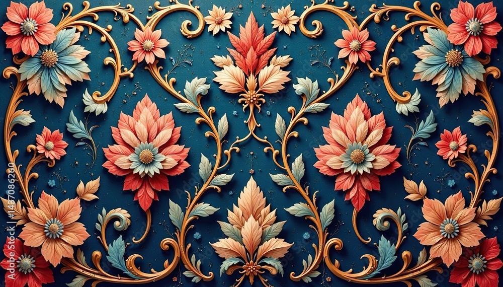Intricate floral damask textile with ornate swirls, surface, art