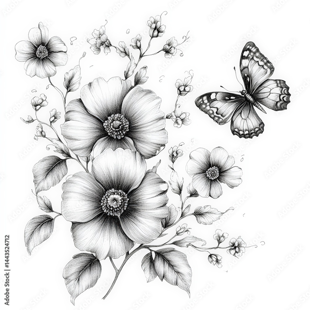 Elegant Floral Illustration With Butterfly On White Background Wallpaper Mural - Decorly Solutions | Decorly Solutions