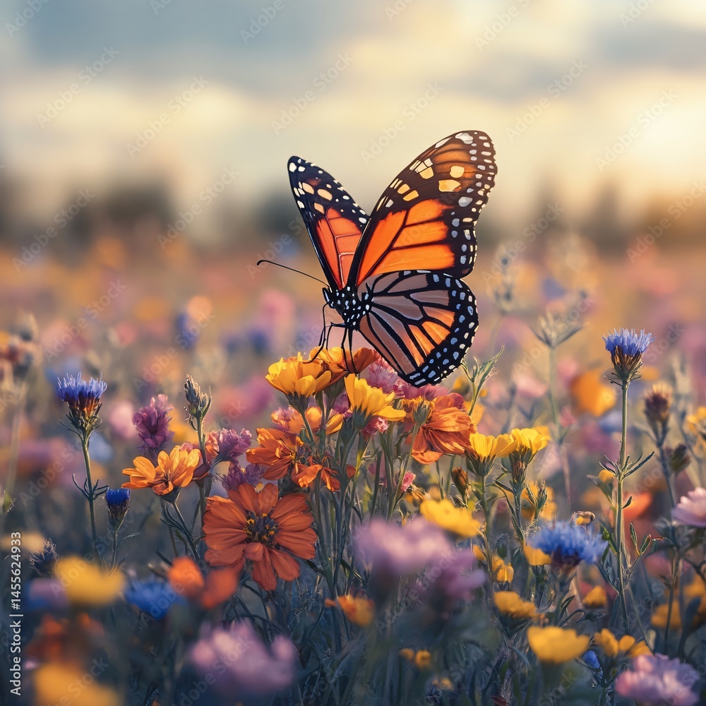 A monarch butterfly rests on a vibrant flower in a sunlit meadow, its orange and black wings open, surrounded by dew-kissed petals and gentle greenery.