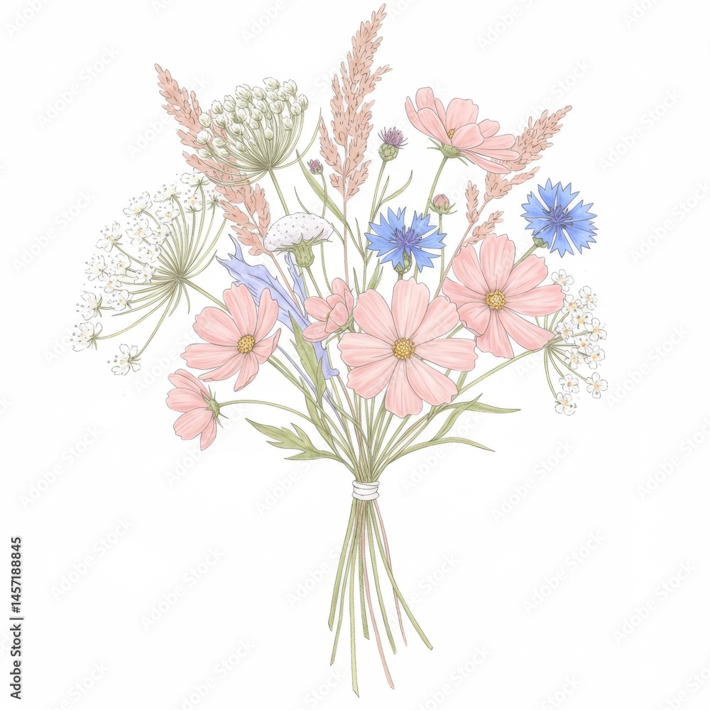 Pastel Pink And Blue Wildflower Bouquet Illustration Wallpaper Mural - Decorly Solutions | Decorly Solutions