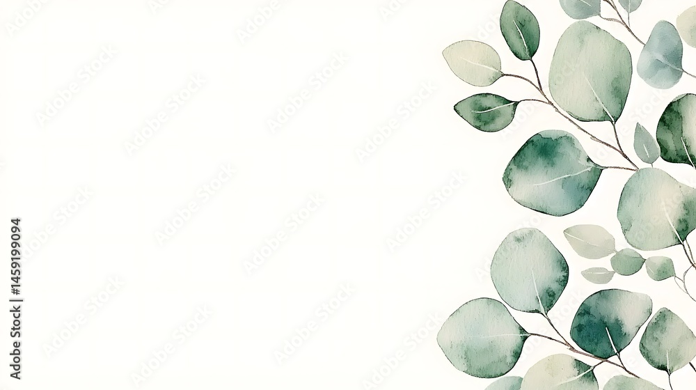Minimalist illustration of green eucalyptus leaves on a white background, positioned on the right side for a clean, natural look.