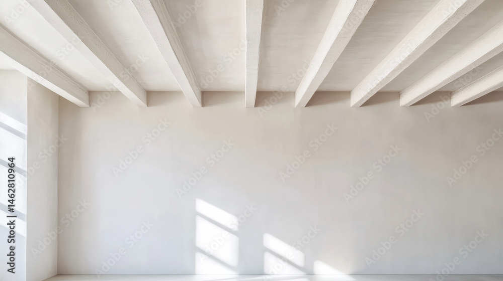 Low angle view of white minimal empty room with beams runnin Wallpaper