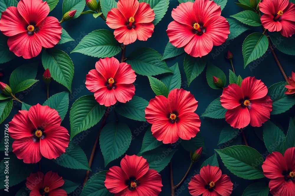Intricate Hibiscus Blooms, Vibrant Colors, Repeating Pattern, Graphic, Elegance, Tropical Flower Pattern