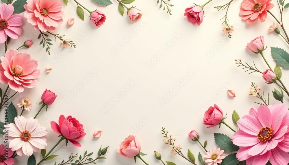 A delicate arrangement of pink roses and hearts forms a charming frame on a pastel green background, perfect for romantic messages or elegant designs.