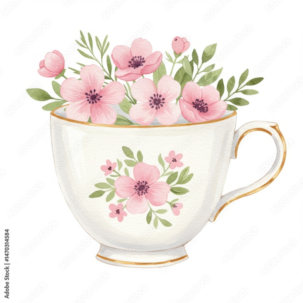 Watercolor Floral Bouquet In Teacup